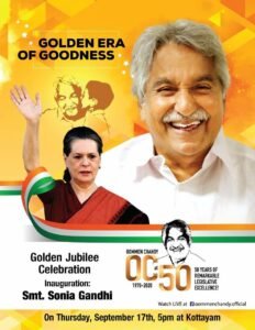 कल एक विधायक के रूप में कांग्रेस के श्री ओमान चांडी (केरल के पूर्व मुख्यमंत्री) पुथुपल्ली विधानसभा से 50 वर्ष पूरा कर रहे हैं । इस अवसर पर कांग्रेस अध्यक्ष श्रीमती सोनिया गांधी स्वर्ण जयंती समारोह का उद्घाटन करेंगी ।