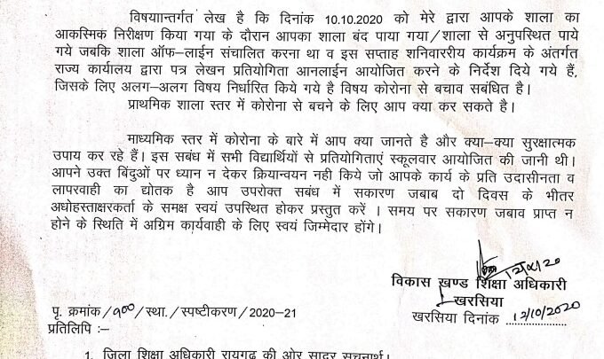 खरसिया : खरसिया विकासखंड अंतर्गत प्राथमिक एवम माध्यमिक शाला के शिक्षक /शिक्षिकाएं इन दिनों विकासखंड शिक्षा अधिकारी ए के भारद्वाज द्वारा प्रताड़ित किये जा रहे है।कोरोना संक्रमण को देखते हुए राज्य शासन ने पूरे राज्य में स्कूलों को नही खोलने का आदेश जारी किया है,किंतु विकासखंड शिक्षा अधिकारी ए के भारद्वाज द्वारा विकासखंड खरसियां अंतर्गत लगभग 70 शिक्षकों को दिनांक 10/10/20 दिन शनिवार को अपने निरीक्षण के दौरान शाला बंद पाए जाने के कारण स्पष्टीकरण जारी कर प्रताड़ित किया जा रहा है।साथ ही इस विकासखंड के शिक्षकों को दबावपूर्ण ऑफलाइन क्लास के लिए भी प्रताड़ित किया जा रहा है जबकि सचिव स्कूल शिक्षा छ ग शासन के आदेशानुसार(क्रमांक एफ 21-17/2020/20-1 नवा रायपुर,अटल नगर दिनांक,28/07/2020)ऑफलाइन एवम ऑनलाइन क्लास पूर्णतः स्वैच्छिक है शिक्षकों के अपने स्वेच्छा अनुसार ऑनलाइन/ऑफलाइन क्लास संचालित करना है।
