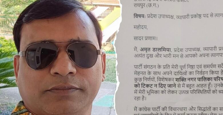 अपने इस्तीफा पत्र में अमृत विजय डालमिया ने आरोप लगाते हुए कहा कि श्याम सुंदर अग्रवाल को कांग्रेस से नगर पालिका अध्यक्ष के प्रत्याशी नहीं बनाए जाने से वे आहत हैं और कांग्रेस में रहकर कार्य कर पाने में असमर्थ महसूस कर रहे हैं इन सभी बातों का उल्लेख करते हुए पार्टी से रुष्ठ होकर अपने पद(प्रदेश उपाध्यक्ष) कांग्रेस व्यापार प्रकोष्ठ से त्यागपत्र सौंप दिया।