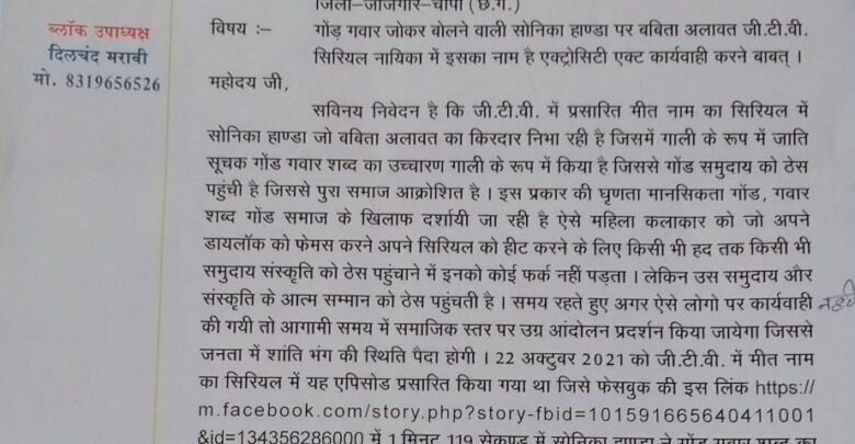 गोंडवाना गणतंत्र पार्टी एवं सर्व आदिवासी समाज के तत्वाधान मे Zee टीवी पर मीत नामक धारावाहिक पर सोनिका हान्डा पर ST/SC एकट्रोसिटी एक्ट पर fIR किया गया। ज्ञात हो कि Zee टीवी पर मीत नामक धारावाहिक मे गोंड जनजाति पर जाति सूचक शब्द का प्रयोग किया गया है जिस पर पूरे देश भर के गोंड जनजाति समाज आहत हुए हैं, जिसके कारण पूरे देश में जगह जगह FIR कराया जा रहा है उसी कड़ी में आदिवासी समाज आक्रोशित होकर सक्ती थाना में FIR करवाने और कड़ी कार्रवाई करने के लिए एक जुट होकर थाना पहुंचे।