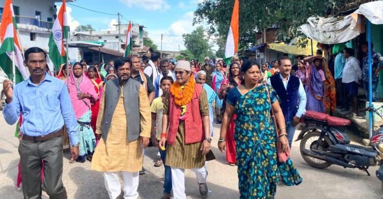सक्ती : राजा धर्मेंद्र सिंह एवं पंडित देवेन्द्रनाथ अग्निहोत्री की जनाधिकार पदयात्रा का चतुर्थ दिवस आज पतेरापालीखुर्द, कंचनपुर, बगबुड़वा, डोड़की, टोहिलाडीह, जांजग, बैलाचुंआ, जगदल्ला होते हुए जगदल्ली पहुंची, जहां रात्रि विश्राम करेंगे। पदयात्रीयों का ग्राम पतेरापाली में जनपद सदस्य गायत्री सिदार के नेतृत्व में महिलाओं ने श्रीफल भेंट कर फूल मालाओं से स्वागत किया एवं भारी संख्या में एकत्रित हो कर पदयात्रा में शामिल हुए साथ ही गांव के सरपंच उपसरपंच पंचगण आदि उपस्थित रहे।